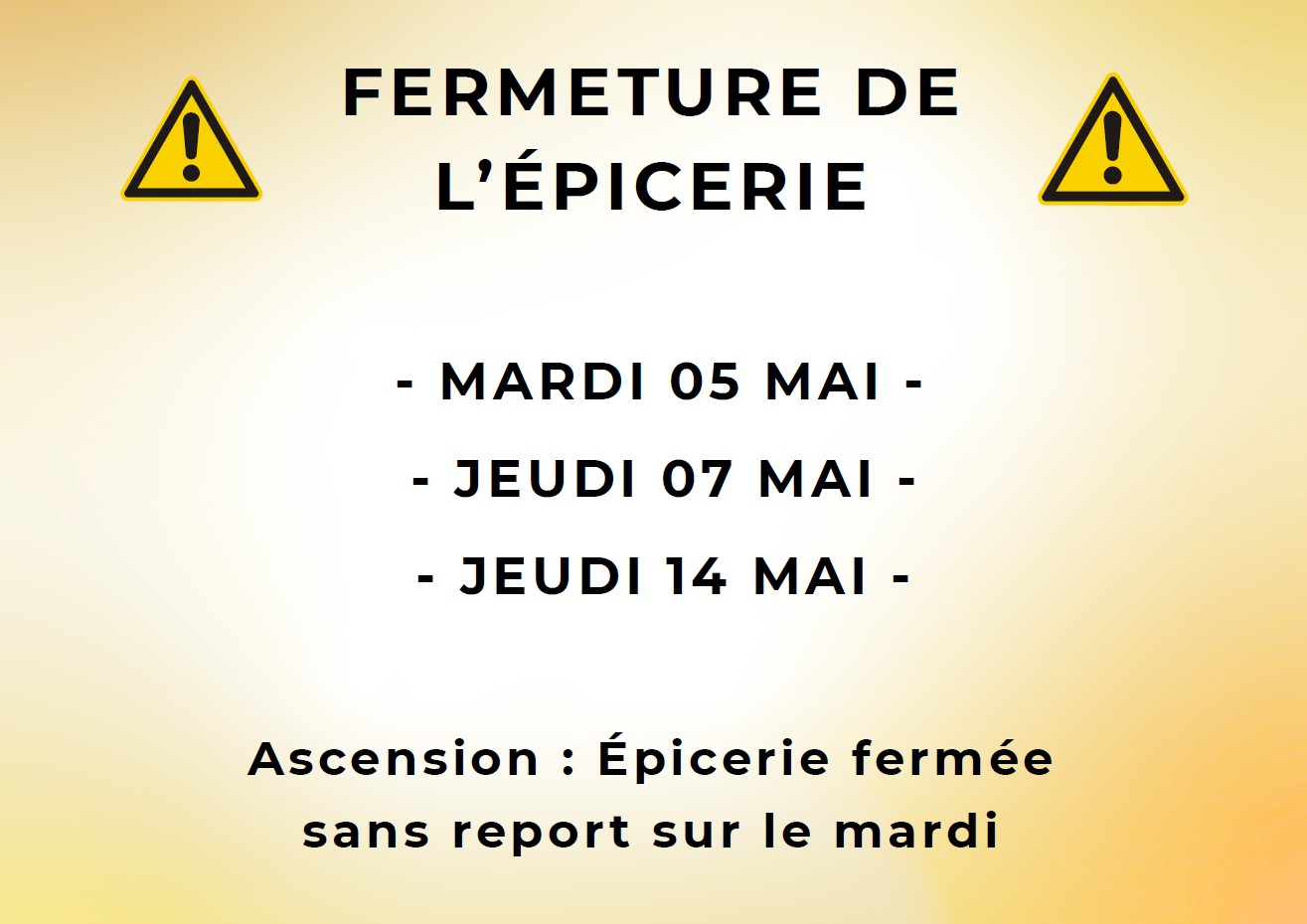 📢 Information solidarité Mairie23 avril 20260 La Maison des Solidarités de Ploërmel vous informe des prochaines fermetures de l’épicerie sociale du Bois Vert pour le mois de mai :